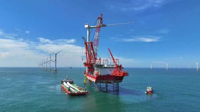 ▲全球首臺(tái)16兆瓦超大容量海上風(fēng)機(jī)吊裝現(xiàn)場(chǎng)? 三峽傳媒供圖